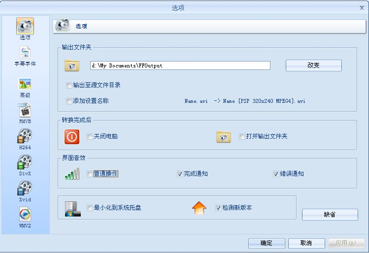 例如:更改输出文件夹为d:\My Documents\FFOutput后,则转换后的内容都将输出至此