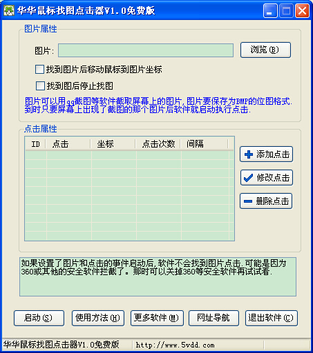 华华鼠标找图点击器是华华软件工作室新推出的一款鼠标点击器,是继定时点击器后的一款新的点击器.华华鼠标找图点击器顾名思义就是可以设置只要屏幕上出现了某一个图片,就执行鼠标点击操作。比如有些抢购的就是时间倒计时到了就设置抢购的按钮可用,那这样的话就可以用华华鼠标找图软件,设置只要找到抢购的按钮就自动点击。