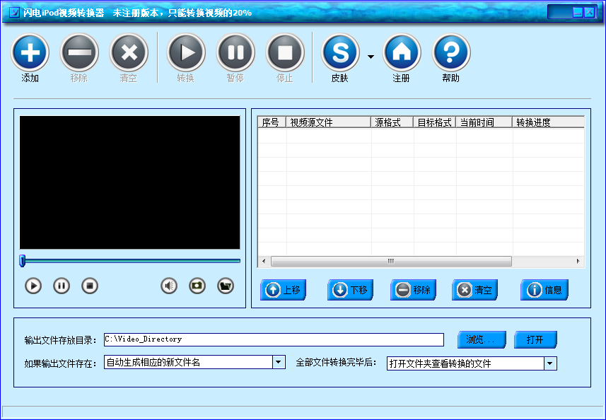 本转换器还针对iPod touch进行专门优化,使您更好体验iPod touch的魅力。还支持各种视频文件的播放预览,支持更换软件皮肤,操作极为简单,支持批量转换,支持自动关机。