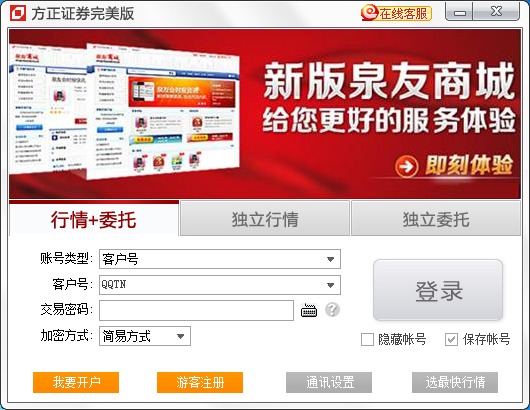 方正证券泉友通完美版分为行情+委托、独立行情、独立委托三大板块,能够带给用户更好的服务体验。