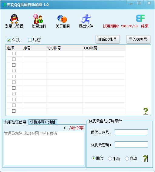 布凡QQ批量自动加群是一款由布凡软件最新制作的一款自动加QQ群软件,这是一款非常实用的QQ自动加群工具,有了这款qq自动加群软件,您就可以按照关键字在线查找采集,实现全自动智能操作,解放双手,提高营销效率,欢迎QQ营销推广人员免费下载使用!