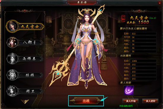 获得美人后,在美人界面点击【出战】,即可派遣美人出战,伴您一同征战大荒。