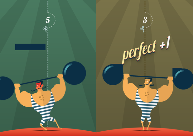 开始之后,长条形的重物块就会出现在举重肌肉先生上方,头顶有一条分割线,当重物出现在头顶并正好二分之一处时,点击屏幕即可切段,这样重量分别落在两边,保证举重的平衡。游戏的关键点在于保证重物正好从中间切段,失误越多,失败的越快。
