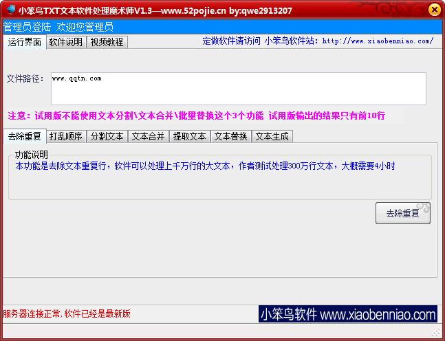 小笨鸟TXT文本软件处理魔术师破解版是一款好用的文本处理工具,这款软件具有去除重复、打乱顺序、分割文本、合并文本、提取文本、文本替换、文本生成等多个功能,非常实用。腾牛小编带来的这个版本为破解版,无需登陆,只需点击“免费试用”即可正常使用。
