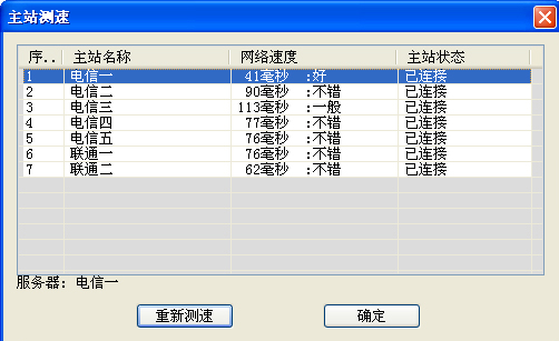 用户登录前,可点击客户端登录界面的【测速】按钮,系统会弹出〖主站测速〗对话框,并自动测试该客户端连接各个行情站点的网络速度,然后选中主站列表中最快的站点。点击【确定】按钮后,该站点自动成为登录站点。