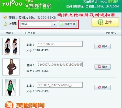 美图淘淘右拍版设有选择上传文件夹及新建相册功能,方便卖家日后归类查找图片。在此步骤,点击上传按钮即可完成传送任务。