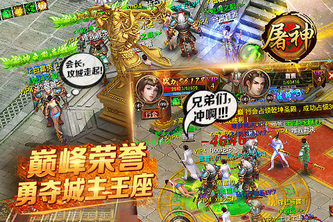 屠神》是一款以热血战争为主题、全新ARPG即战式动作手游。游戏除了完美呈现以战、法、道职业为核心的元素外,还融入了万人攻城、神兵系统、多人在线组队等游戏特色。逼真写实的场景视觉效果,满屏爆装的极致快感,精美绝伦的地图,酷炫华丽的特效,还原原汁原味的经典传奇,力求给玩家最无与伦比的畅爽PK体验!2015,王城烽火重燃心中的热血,让我们一起回到十年前那个奇迹的时代!
