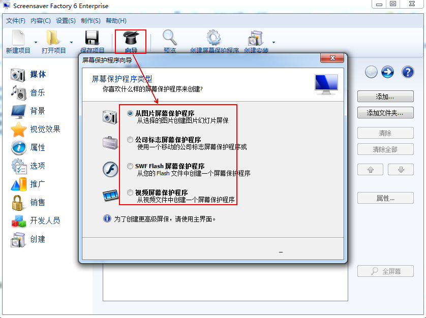 首先打开软件可以点击向导制作你需要的屏保种类,选中文件设置参数即可。