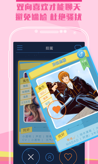 扭蛋电脑版是一款二次元聊天脱团应用。这款软件汇集了喜欢二次元志同道合的朋友们。扭蛋独创属性匹配算法,帮户用户找到最合适的那个人!