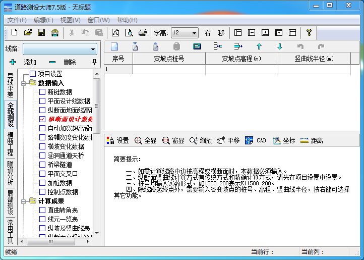 3. 纵断面。可以进行纵断面的设计、计算。竖曲线计算方式可以选择传统或精确算法。
