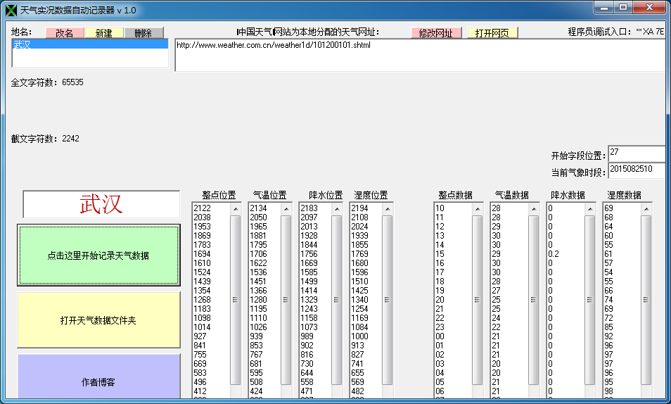 天气实况数据自动记录器可以实现天气数据的半自动记录(点击一下软件中的一个按钮,软件自动记录24h内的天气数据并保存为excel文件)。以后在论文、报告中绘制连续天气情况曲线图、柱形图,美观大方。