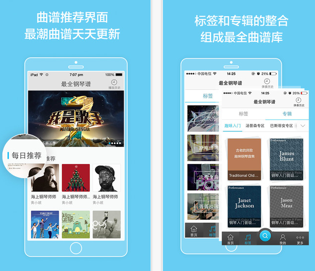 App里有我们用心整理的钢琴曲谱专辑,包含流行、古典、轻音乐、爵士等音乐分类。
