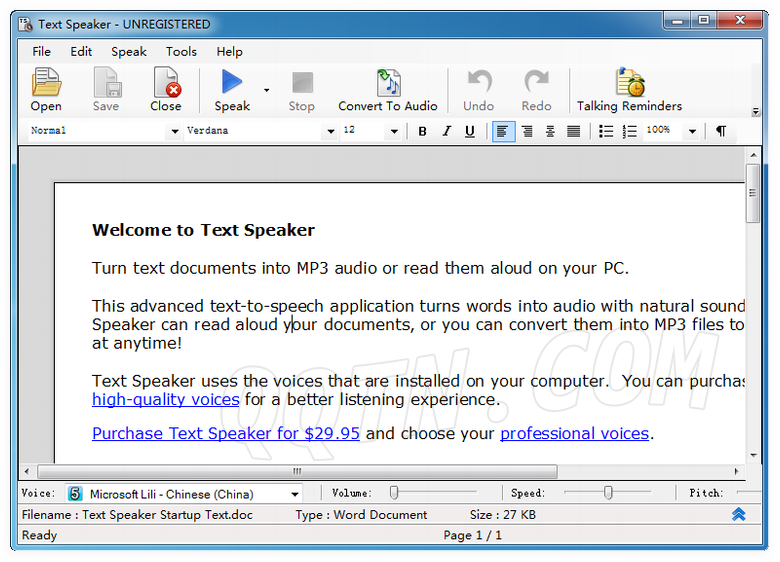 文本朗读器Text Speaker可以将任意文字转换到音频与自然动听的声音。这个文本朗读软件,可以大声清晰阅朗读您的文档,听起来像人声,也可以将它们转换成MP3文件带到任何地方去听。