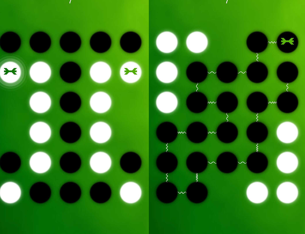 游戏的玩法非常简单,类似于黑白棋的画面,有标记的棋子是可以作为起点的,所有被划过的棋子颜色都会变成反向的色调,只要利用所有起点将画面上的所有棋子都变成统一颜色,王子与公主就可以幸福的生活在一起了。游戏的玩法虽然简单,但是真想通关却没有那么容易了。简单来说就是:烧脑!