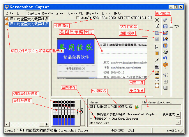 专业截图软件SCREENSHOT CAPTOR(截图捕手)是一个最好的一流的工具抓取,处理,注释和共享截图。 提起截屏(也有称为截图、抓图、屏捕),很多人会首先想到Hypersnap和Snagit。和他们比起来,SCREENSHOT CAPTOR 免费、体积小且更易于使用。