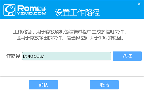 工作路径,用于存放刷机包编辑过程中生成的临时文件,也用于存放输出的文件。请选择空间大于10G的硬盘。