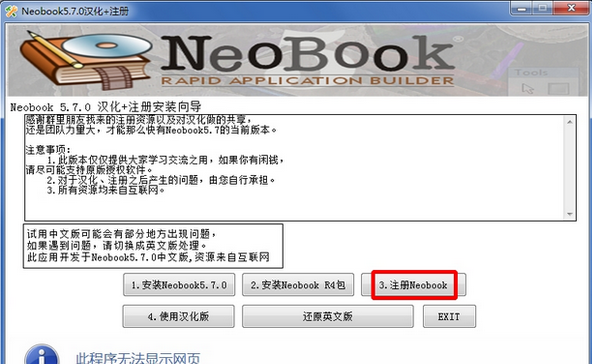按照1-2-3的顺序来安装NeoBook,如果要使用汉化版,可以在NeoBook安装后,点击“使用汉化版”,