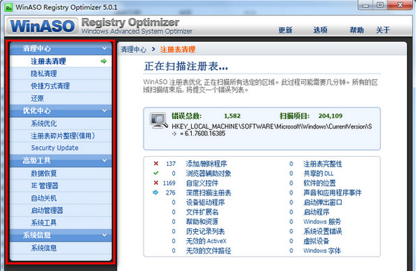 WinASO Registry Optimizer中文版软对系统运行速度的提升是相当惊人的,WinASO Registry Optimizer被很好的设计出来修复绝大多数跟注册表有关的问题。