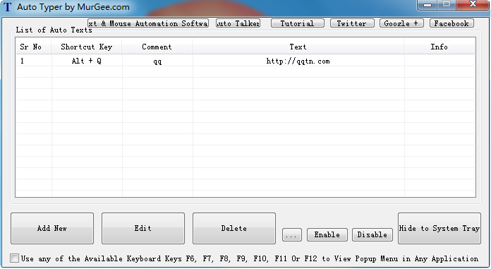 自动输入Auto Typer 是一款简单小巧的软件。可以帮你快捷输入文本文字。可以这是快捷键,然后定义对应的文本内容。这时,将软件最小化,只要按下对应的快捷键即可自动输入预设的内容。非常方便。