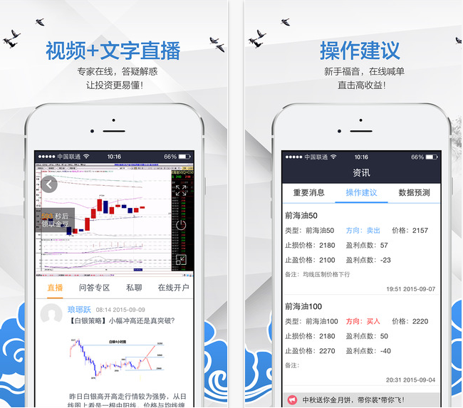 多种服务方式,以微信、微博、短信、APP推送、视频教室等方式第一时间为客户发送资讯与策略。专业投资顾问, 提供全天无间隔服务