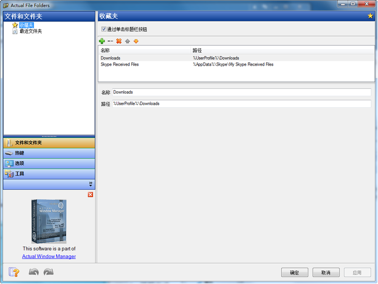 Actual File Folders文件夹增强软件 添加了两个标题按钮,所谓的收藏夹和最近的文件夹。能够在所需的文件夹之间点击切换。这些按钮在整个Windows操作系统扩展。这意味着你可以用它们在任何普通的Windows资源管理器窗口,文件管理器应用程序,并使用系统文件相关的对话窗口,例如任何其他软件,微软的Word,IE浏览器,或总指挥官。