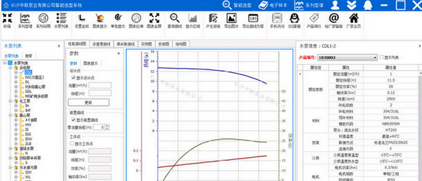 水泵选型软件根据扬程选择泵的合适使用范围与结构、流量、根据动力源供应,选择驱动动力、根据用途选择泵的结构(清水泵、消防泵、污水泵等)。