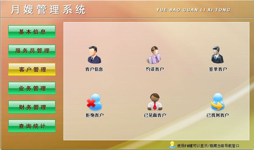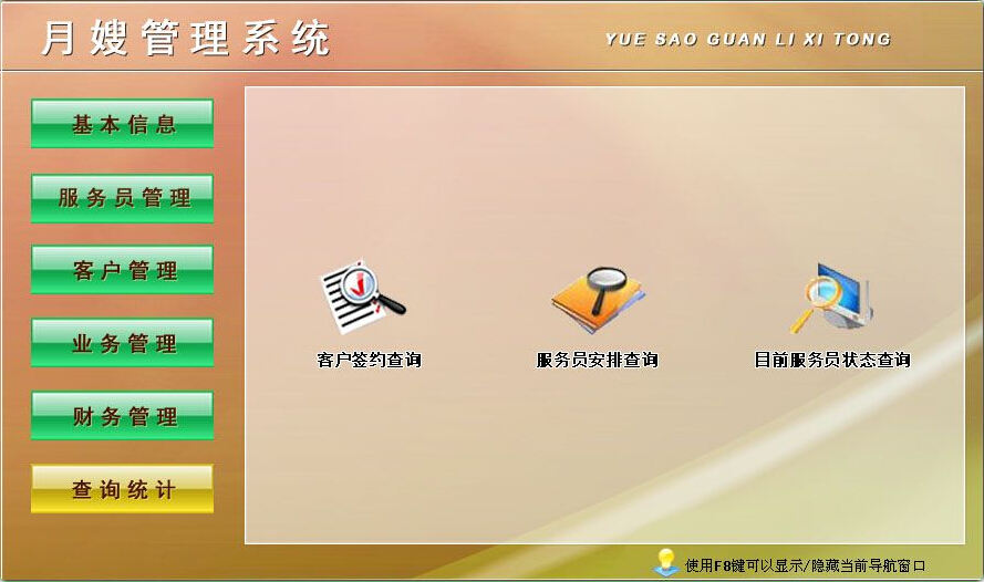 月嫂管理系统是针对月嫂中心提供的一月嫂行业管理软件,主要了基本信息输入,服务员管理、客户端管理、业务管理、财务管理以及查询统计功能。