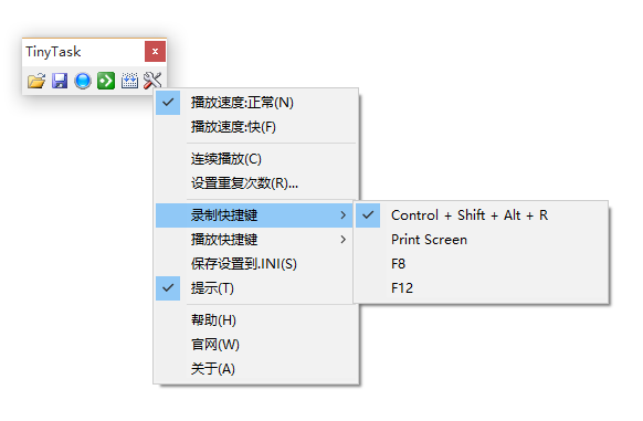 屏幕录像软件Tinytask通过记录/回放提供了快速简单的自动化。它是简约的设计为例:整个程序只有33K - 和超过14K的图形界面,这意味着可执行部分是非常小的,高效的。