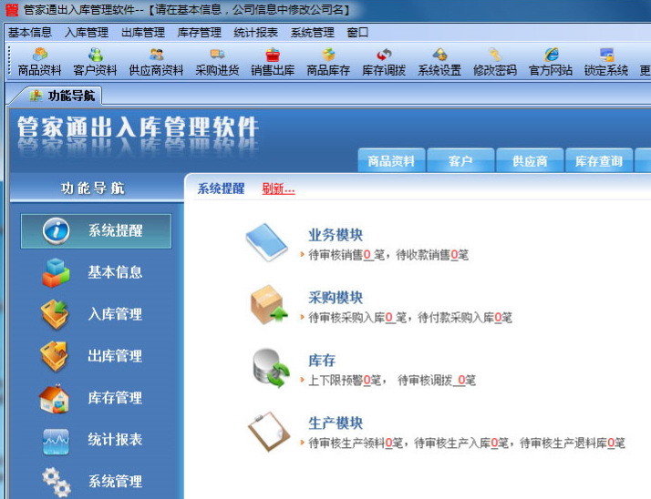 管家通出入库管理软件是一款专业的仓库管理软件,其中包含商品销售管理系统 ,库存管理系统(仓库管理系统),报表系统等子模块。软件界面设计简洁,美观,其人性化的软件流程,使普通用户不需培训也能很快掌握软件操作使用方法,上手极易。强大报表与集成查询功能是本软件的最大特色,所有功能在用户需要的使用地方自然体现,不用打开多个窗口重复查询。管家通出入库管理软件广泛适用于企业,商贸公司,个体门店等用于商业销售管理, 库存管理等,客户管理,员工管理等场合,是您企业进行信息化管理的强大工具。