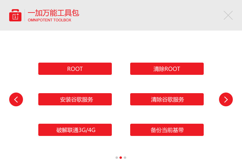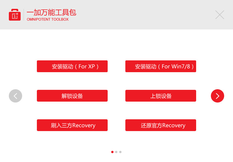 一加手机万能工具包并非官方出品,是网友发布在一加社区中的一款一加手机工具箱软件,具有手机驱动安装、手机解锁、刷机、清除ROOT等功能,制作多种型号的一加手机。