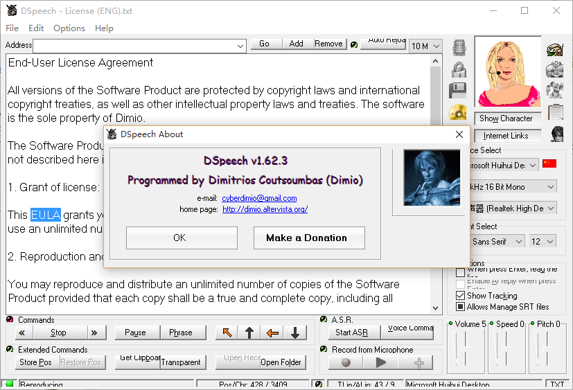 DSpeech是TTS(文本到语音)计划与ASR(自动语音识别)集成的功能。它能够以朗读的书面文本,并选择基于用户的声音回答可以读的句子。它是专门设计来快速并直接提供的功能和改善由这种程序的所请求的实际用途。