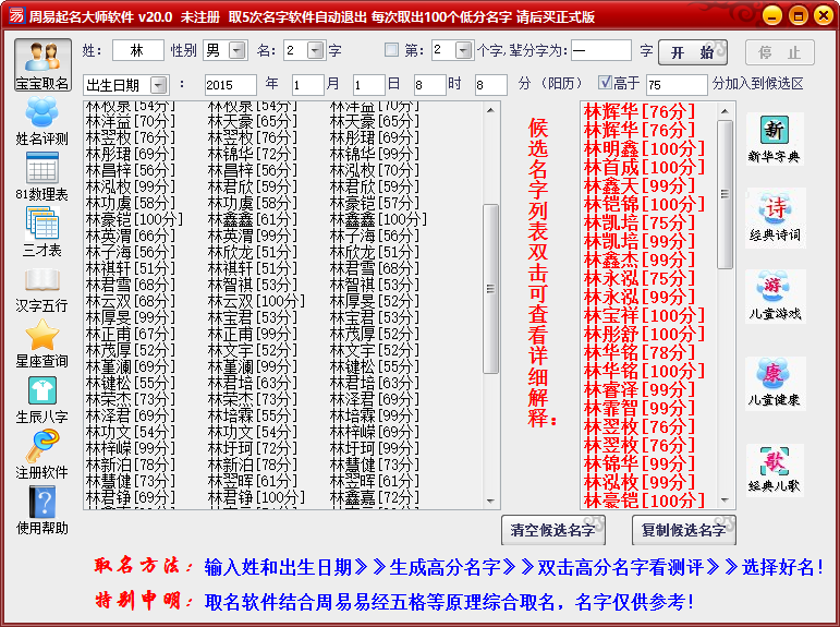 真正为您的宝宝取到评分高 (99-100分)、同时参考各 种书籍、文献、字典,一次产生几万个好名字。