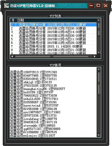 网易云音乐pc客户端v2.10.6.200601 最新版迅雷VIP账号神器是一款由琅琊阁软件工作室官网推出的2016最新迅雷会员账号获取工具,这款软件可以帮助你免费获取迅雷VIP账号的工具,每天不定时更新多次,大量VIP账号提供给网友免费使用,想使用迅雷离线下载和高速下载吗?不想花钱充迅雷会员吗?那就来试试这款迅雷VIP账号神器吧!