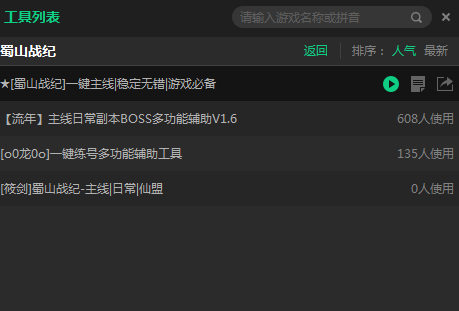 新浪蜀山战纪辅助,目前共提供了4款游戏脚本,能够帮助玩家更加轻松的玩游戏,提供了一键主线、小号练级、刷副本打boss等功能。