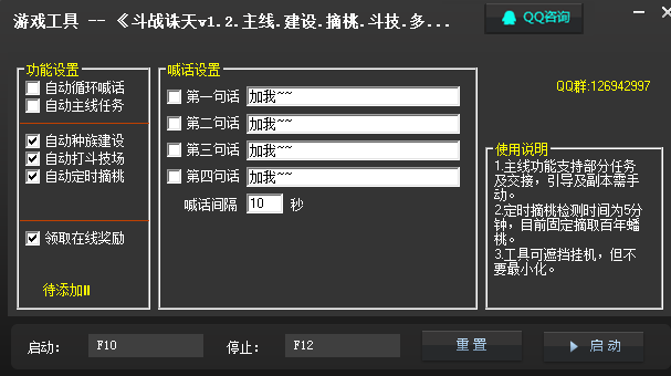 斗战诛天多功能辅助是一款应用于腾讯最新页游大作斗战诛天游戏脚本工具,脚本提供自动主线任务、种族建设、定时摘蟠桃、斗技场等多种功能,支持自动循环喊话。是一款非常不错的斗战诛天挂机脚本工具。欢迎各位玩家朋友下载测试!