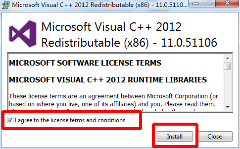 2、双击运行VC++2012_x86.exe这个文件,出现安装界面,运行库是英文界面,如下图所示,勾选我同意,点击install开始安装