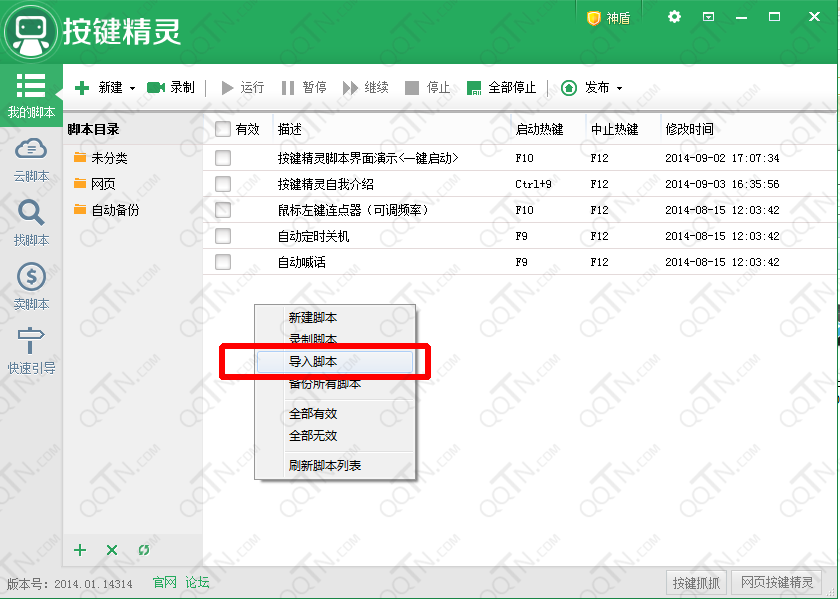 2、打开按键精灵,左侧选择我的脚本,然后右键选择导入脚本