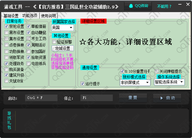 三国乱世全功能辅助是官方推荐的一款全能辅助,能够完美支持魏蜀吴三国任意角色使用。提供祭祀、黑市、草船借箭、购买装备、处理政务等日常功能。本辅助完全免费使用,全面支持windows所有32/64位系统使用。全自动帮助你完成游戏日常挂机升级。