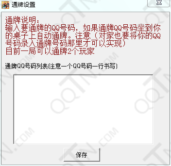 输入要通牌的QQ号码,如果通牌QQ号码坐到你的桌子上自动通牌。