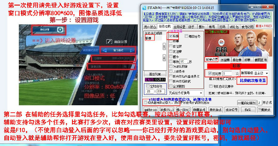 游戏分辨率为窗口800x600(画质选择低),不可最小化游戏,挂机比赛必须设置(非经理人模式):游戏按键须设置为键盘---FIFA2基本---否则联赛不会动