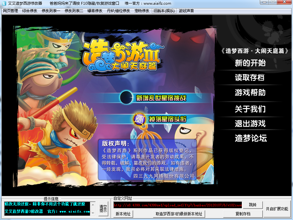 艾艾造梦西游3辅助主要提供怪物暴击,攻击秒杀,炼丹修改,人物修改,宠物修改,物品修改,法宝无冷等功能,按F10可隐藏恢复游戏窗口。