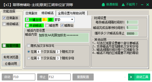 3、根据自己的需求勾选设置要启动的脚本功能(如练级喊话,日常副本)