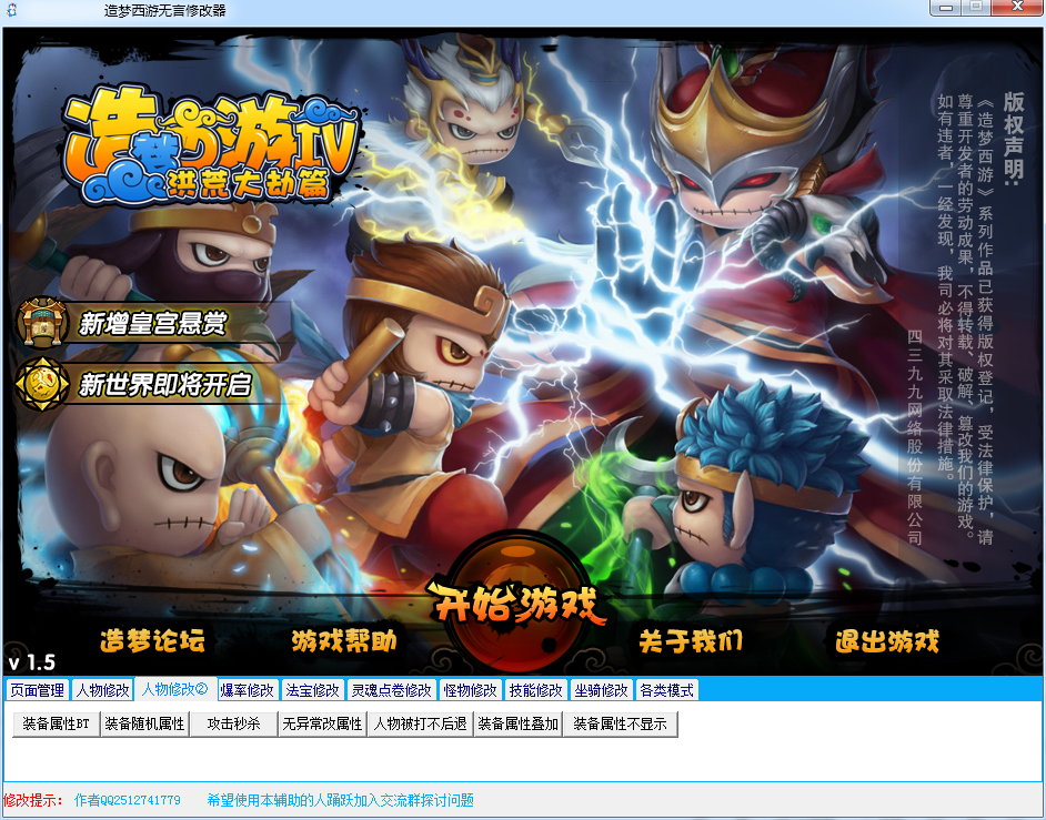 造梦西游4无言修改器将功能分为页面管理、人物修改、爆率修改、法宝修改、灵魂点卷修改、怪物修改、技能修改、坐骑修改、各类模式供十个板块。