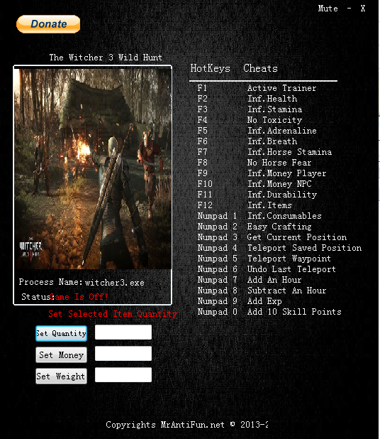 巫师3狂猎修改器+24修改器是国外的MrAntiFun专门针对同名游戏制作的一款游戏修改器,巫师3狂猎作为最新热门单机大作广受玩家好评,此修改器拥有多达24项游戏修改功能,如无限生命、无限体力、无限氧气等等。喜欢玩巫师3狂猎的朋友们不可错过这款MrAntiFun修改器哦。
