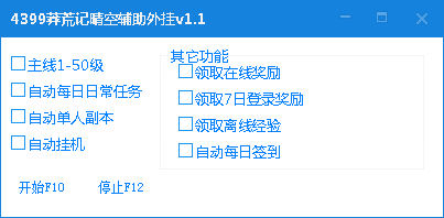 运行4399莽荒纪晴空辅助后,勾选所需功能,然后按F10即可启动辅助,按F12则可停止挂机