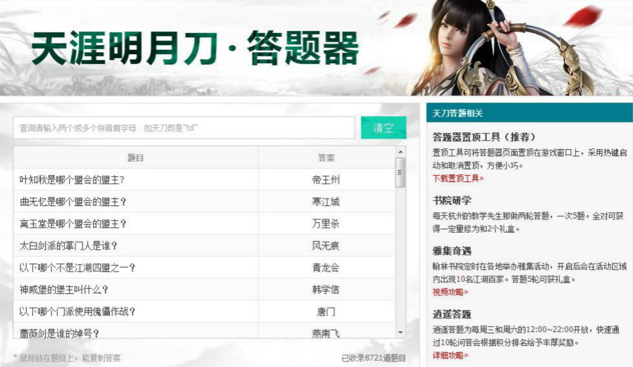 天涯明月刀答题器是由多玩游戏推出的书院研学答题小助手,它一共收录了8721道题,输入需要查询题目其中两个以上的词语拼音首字母,例如天刀即“td”即可快速查询,答题器适用于书院研学、雅集奇遇、逍遥答题等活动,欢迎下载使用!