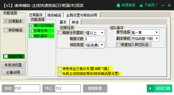 功能:【兼容win7/win8/xp】【一键主线60/120/任意等级,稳定快速】【组队副本】【日常任务】【每日奖励】【自动喊话】【更多功能增加中】