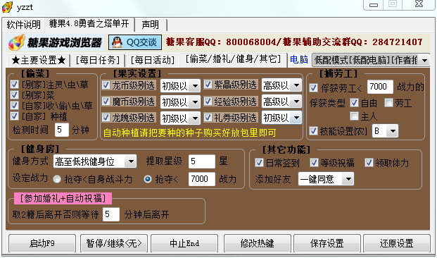 糖果勇者之塔辅助工具主要提供了偷菜、果实、健身房、捕劳工等相关辅助功能,还有每日活动、每日任务一键挂机自动完成哦。