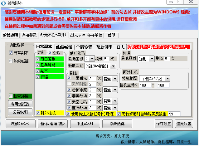 使用战无不胜辅助脚本修改功能后记得保存设置后再启动,提供了厉兵秣马、自动副本、押镖、野外挂机以及自动喊话等功能。