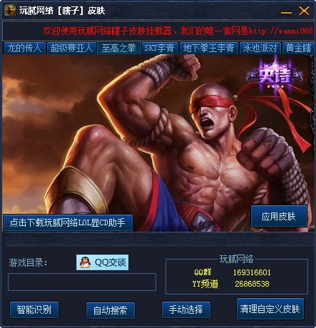 玩腻网络瞎子皮肤挂载器是专为英雄联盟游戏中的盲僧·李青制作的皮肤修改器,其中包含了七款皮肤,玩家可以任意免费修改。